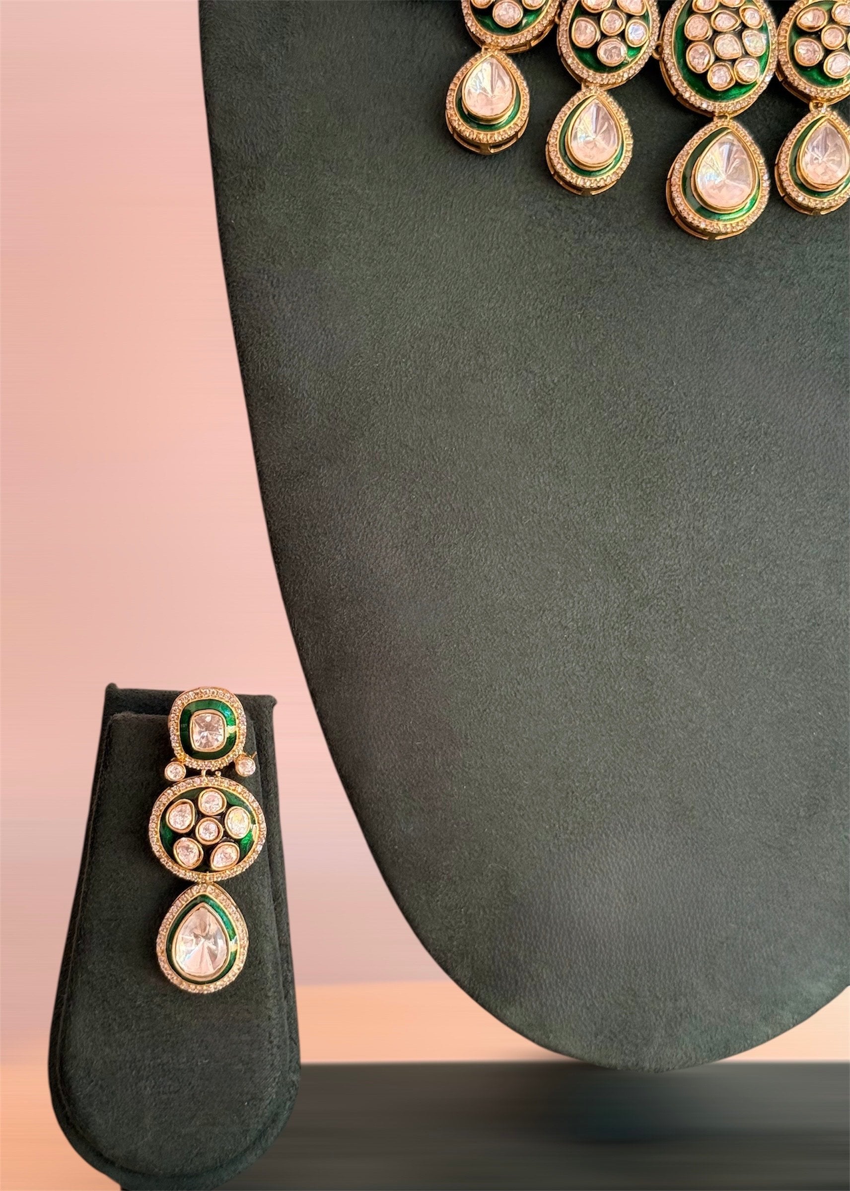 The Kiana Royal is a high-contrast bridal suite that balances traditional Indian craftsmanship with a sophisticated, botanical aesthetic. This collection is designed to frame the bride in light, from the crown of her head to the curve of her neck.